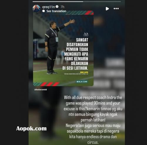 “Dengan segala hormat coach Indra, pertandingannya dimainkan selama 90 menit dan alasan Anda ini? Kemarin, Timnas yang saya nonton semua bingung kayak enggak pernah latihan,” tulis Greg Nwokolo melalui Instagram Stories-nya, @greg11n. Ia juga menambahkan bahwa negara lain saat ini semakin serius dalam memajukan sepakbola, sedangkan Indonesia masih berkutat dengan drama yang berulang dan pola kerja yang stagnan. “Negara lain juga serius mau maju sepakbola mereka, tapi di negara kita hanya endless drama dan circus. Semua kembali ke zona nyaman,” lanjutnya.